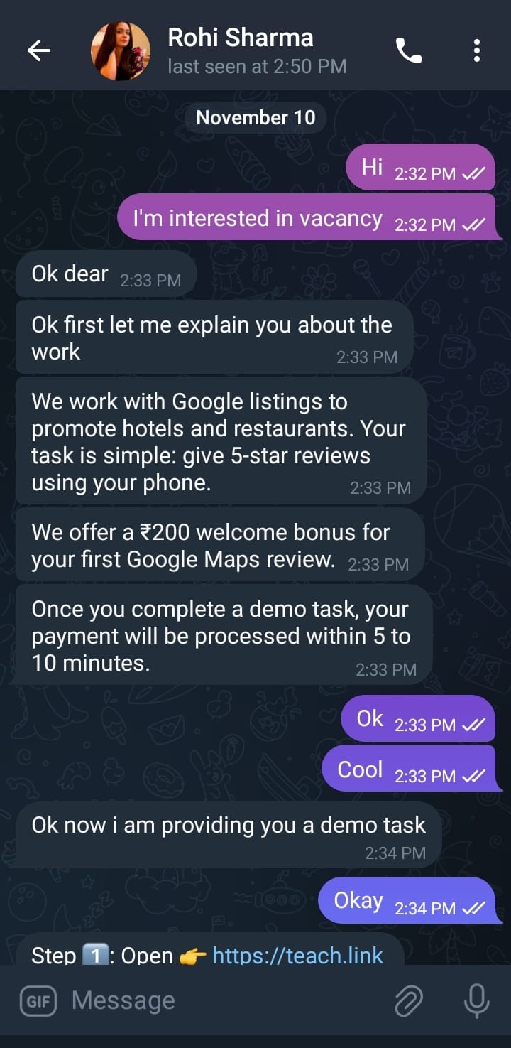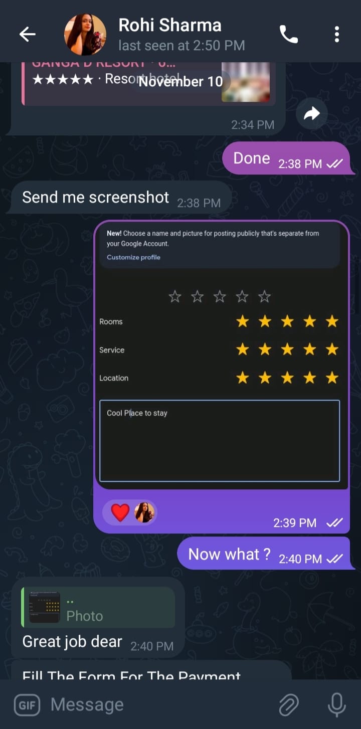 Chronology of Events The scam began when the attacker contacted the victim on Telegram under a false identity, offering paid work for completing Google Map reviews. To establish credibility, the scammer assigned a “demo task” in which the victim was instructed to perform several steps: open the provided link, select a resort, leave a 5-star review, and send a screenshot. This initial task served multiple purposes: