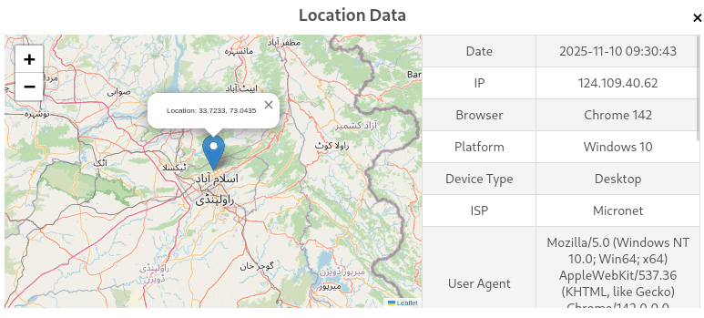As part of our investigation, our team conducted a controlled social-engineering operation. We engaged the scammer and successfully persuaded them to click on an IP-logging link designed to capture network metadata. Once the scammer accessed the link, the logger recorded the following information: