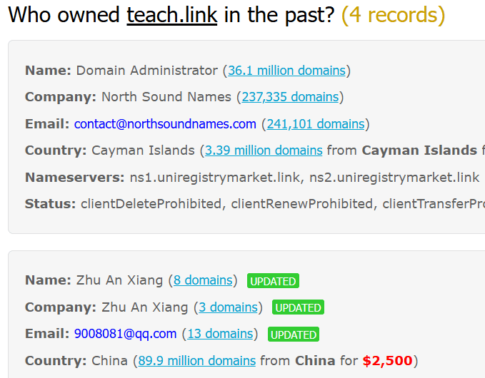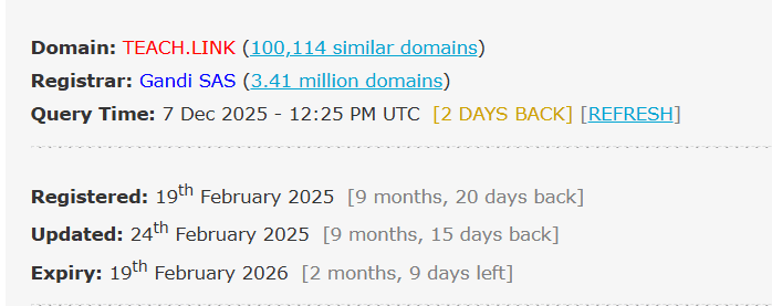 Suspicious task URL (teach.link/…) A shortened link was provided for the “demo task,” which is consistent with link-tracking and redirection commonly used by scammers. The domain teach.link, registered with Gandi SAS and expiring in February 2026, now displays fully redacted ownership information, with the only accessible historical record dating back to legacy Chinese WHOIS data from 2018 identifying Zhu An Xiang as the registrant, using the email 9008081@qq.com.