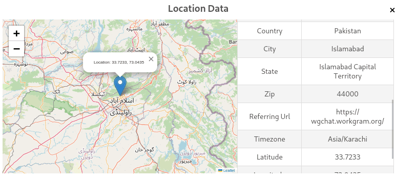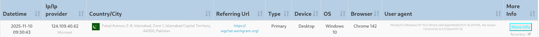 Through these steps, including the use of an IP logger, we identified that the threat actor accessed the link from Islamabad, Pakistan. The referrer URL in the IP-logger data (wgchat.workgram.org) indicates that the attacker was likely using WorkGram a cloud-based Telegram tool for bulk messaging and multi-account management, commonly exploited in large-scale spam and scam campaigns.